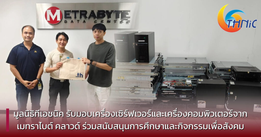 เมื่อวันที่ 23 มกราคม 2569 คุณภาคภูมิ ไตรพัฒน์ ผู้แทนจากมูลนิธิศูนย์สารสนเทศเครือข่ายไทย (ทีเอชนิค) ได้รับมอบเครื่องเซิร์ฟเวอร์และเครื่องคอมพิวเตอร์ปลดระวางที่ยังอยู่ในสภาพสามารถใช้งาน จำนวน 62 เครื่อง จากบริษัท เมทราไบต์ คลาวด์ จำกัด โดยมี คุณพงศกร พรหมมาสา Technical Support Supervisor เป็นผู้แทนมอบในนามของ คุณพันธวัฒน์ อาจศิริมานะชัย กรรมการผู้จัดการ บริษัท เมทราไบต์ คลาวด์ จำกัด